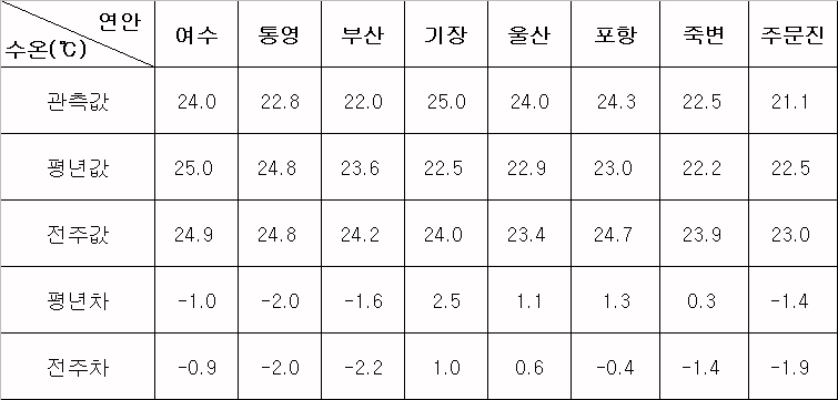 o 2003년 9월 2일 10시 현재 관측된 연안수온은 남해 22∼24도, 동해 남부