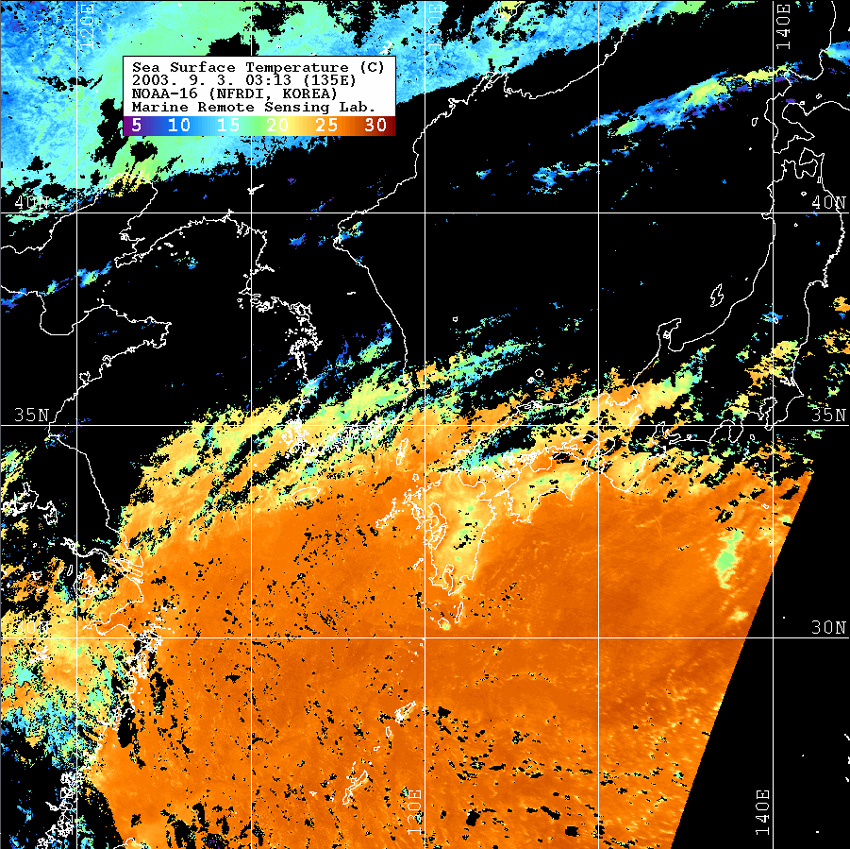 o 2003년 9월 3일 03시 13분 NOAA-16호 위성영상입니다. o 수온분포는 범례를 참고하시기 바랍니다. o 검은색은 구름과 육지를 나타냅니다.