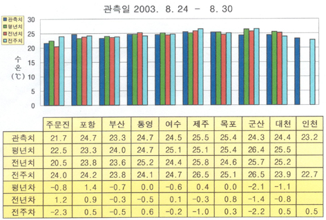 o 최근(2003. 8.26∼ 9.1)의 한반도 연안 표면수온은 동해 연안역에서 섭씨 21∼25도,
