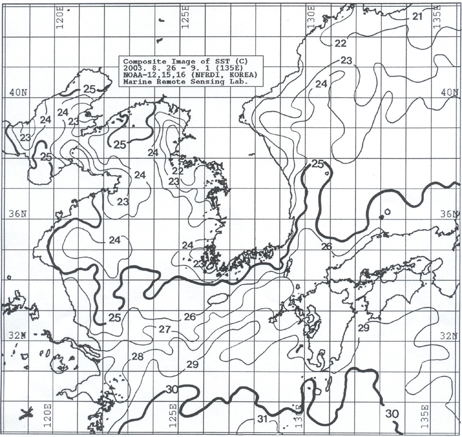 o 대화퇴 근해 23∼24도, 울릉도 근해 25∼26도, 대마도 근해 26∼27도, 제주도 근해