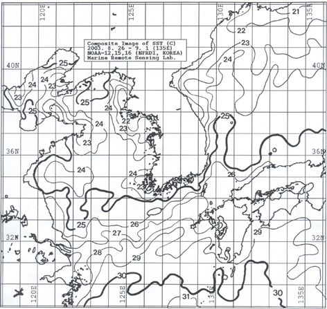 o 수온전선대는 수온 26도를 중심으로 제주도∼대마도간 해역에서 형성됩니다.