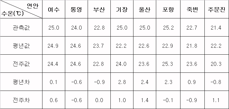 o 평년에 비해 오늘 수온은 여수 비슷하게, 통영 및 부산 0.5∼1도 낮게, 기장 3도