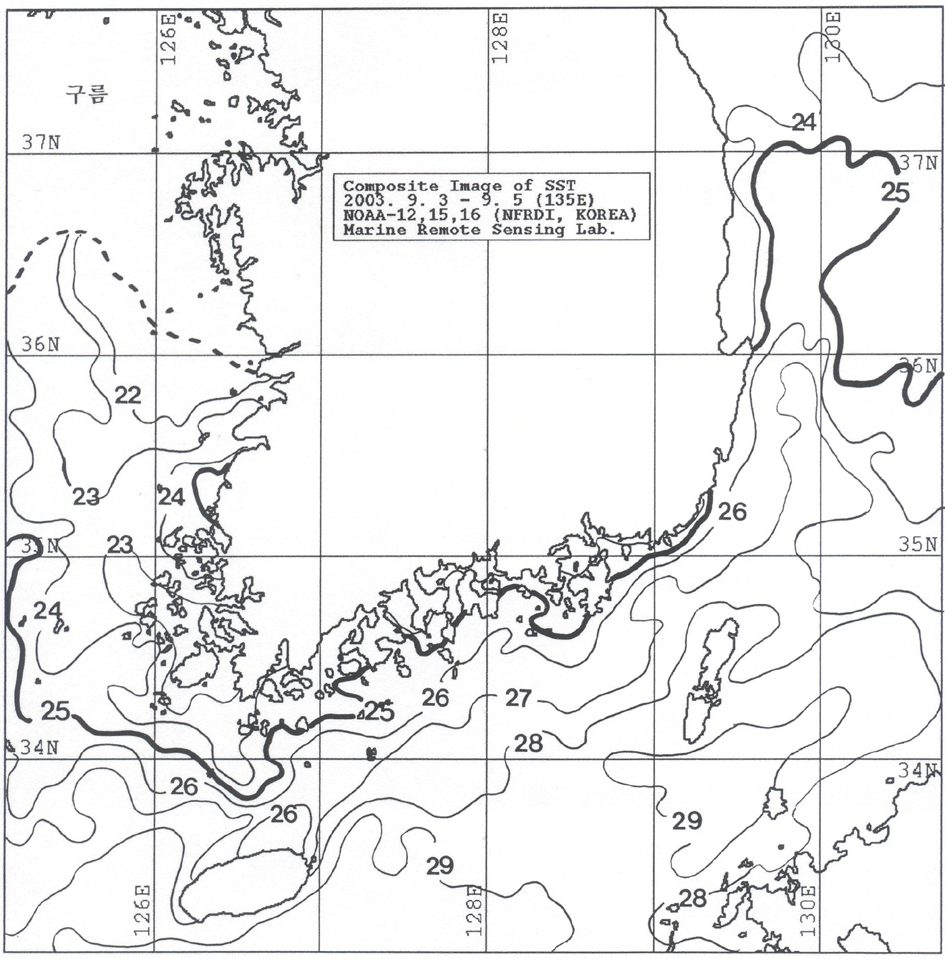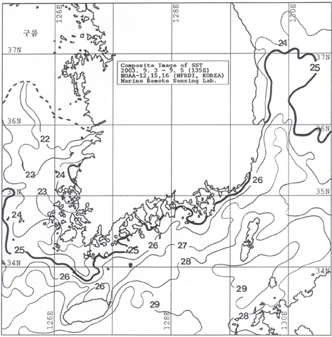 o 아래 그림은 2003년 9월 3∼5일 현재 합성한 위성추정 수온 분포도입니다. o 수온 25도 이상의 더운물이 동해 연안을 따라 북상하고 있습니다. o 진도 연근해역 수온은 23∼25도로 주변해역보다 1∼2도 낮은 수온분포를 나타내고 있습니다.