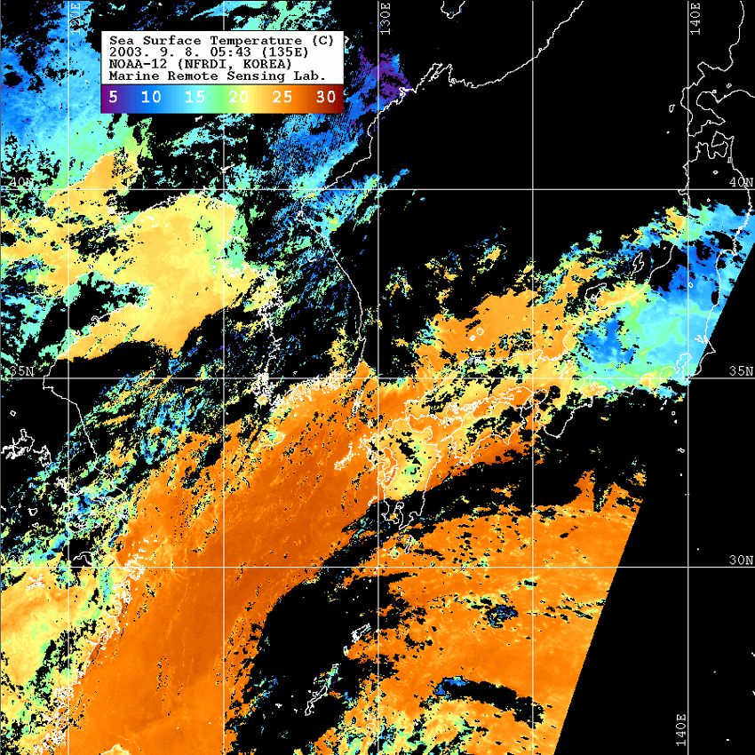 o 2003년 9월 8일 05시 43분 NOAA-12호 위성영상입니다. o 수온분포는 범례를 참고하시기 바랍니다. o 검은색은 구름과 육지를 나타냅니다.