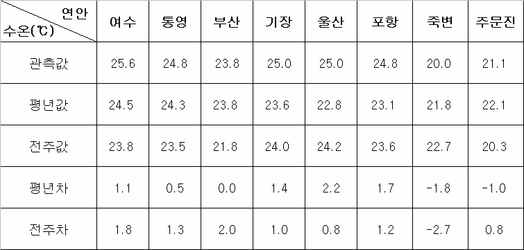 o 2003년 9월 8일 10시 현재 관측된 연안수온은 남해 24∼25.5도, 동해 남부 25도,