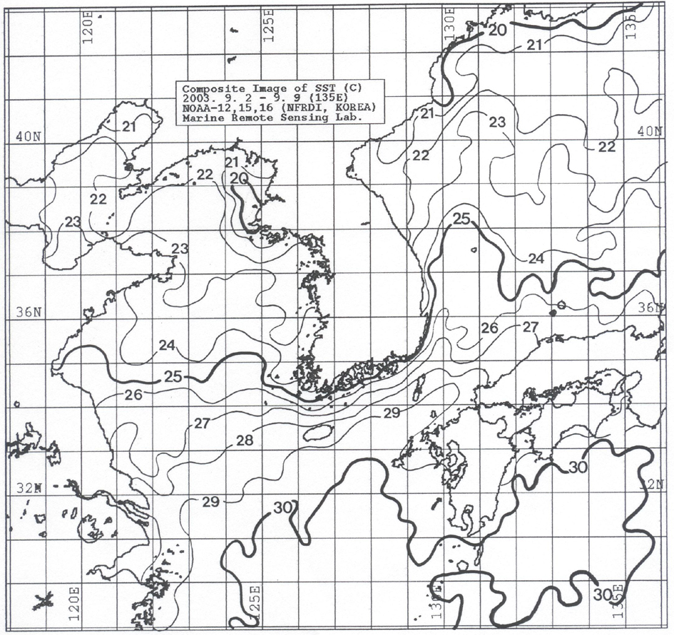 o 수온전선대는 수온 26도를 중심으로 일향초∼제주도∼대마도간 해역에서 형성됩니다.