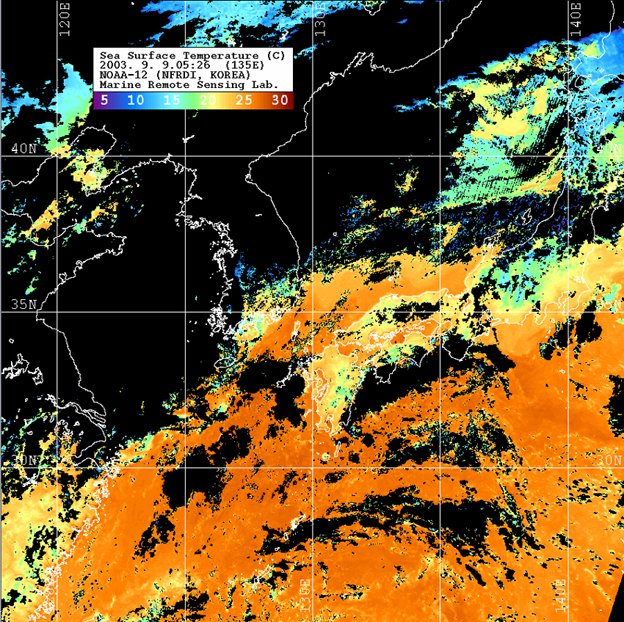o 2003년 9월 9일 05시 26분 NOAA-12호 위성영상입니다. o 수온분포는 범례를 참고하시기 바랍니다. o 검은색은 구름과 육지를 나타냅니다.