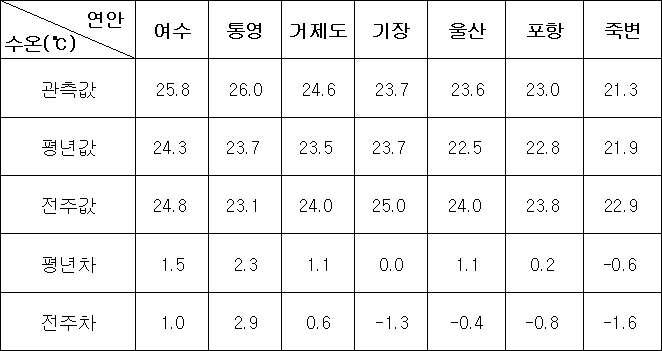 o 평년에 비해 오늘 수온은 여수 1.5도 높게, 통영 2.5도 높게, 거제도 남동해역