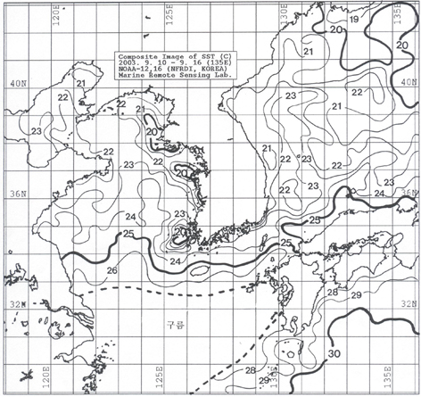 o 아래 그림은 2003년 9월 10일부터 9월 16일 까지 합성한 위성추정 표면 수온 분포도입니다. o 대화퇴 근해 21∼22도, 울릉도 근해 23∼24도, 대마도 근해 24∼25도, 제주도 근해 25∼26도, 일향초 근해 22∼24도, 어청도 근해 22∼23도 내외로 나타납니다. o「평년에 비해」수온은 대화퇴 근해 1도 낮게, 울릉도 근해 0.5도 높게, 대마도 근해 1.5도 낮게, 제주도 근해 0.5도 높게, 일향초 근해 0.5도 낮게, 어청도 근해에서 비슷하게 나타납니다. o 수온전선대는 수온 22도를 중심으로 진도연안 및 태안반도 연근해역에서 형성됩니다. < 위의 그림을 클릭하시면 확대된 수온정보를 보실 수 있습니다 >