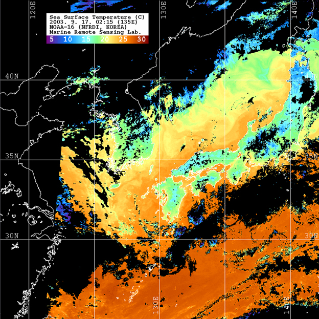 o 2003년 9월 17일 02시 15분 NOAA-16호 위성영상입니다. o 수온분포는 범례를 참고하시기 바랍니다. o 검은색은 구름과 육지를 나타냅니다.