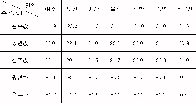o 2003년 9월 23일 10시 현재 관측된 연안수온은 남해 20.5∼22도, 동해 남부