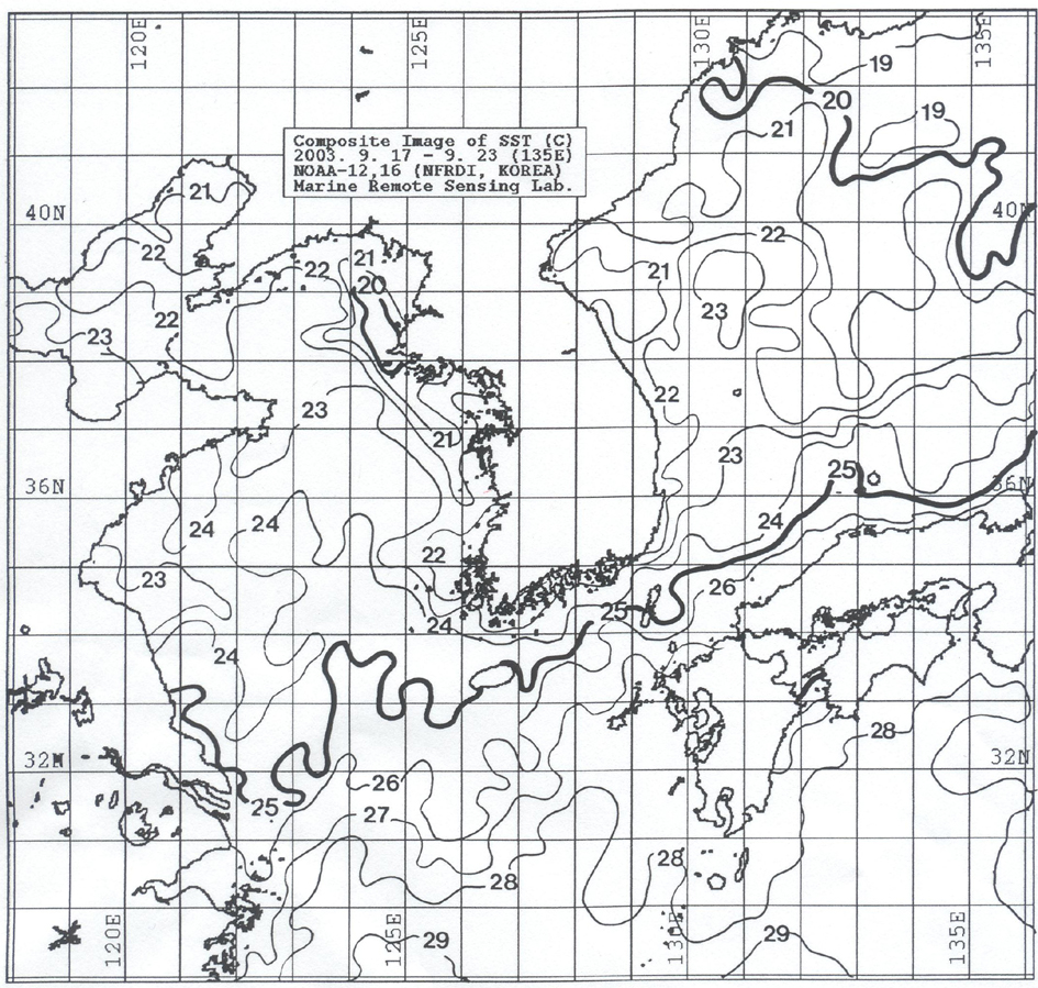 o 수온전선대는 수온 20도를 중심으로 진도연안 및 태안반도 연근해역에서 형성됩니다.