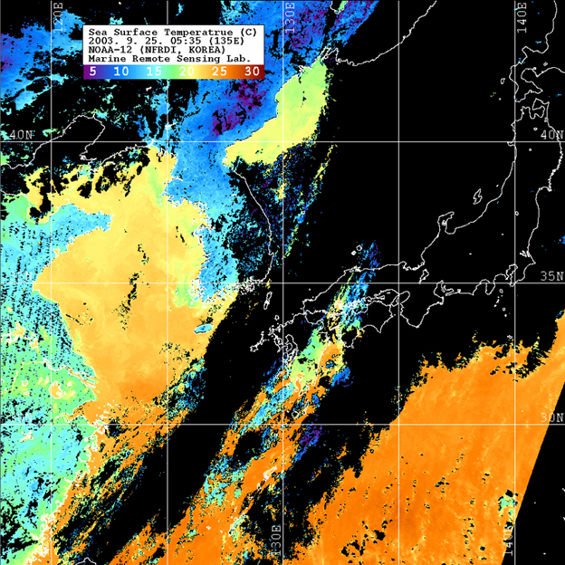 o 2003년 9월 25일 05시 35분 NOAA-12호 위성영상입니다. o 수온분포는 범례를 참고하시기 바랍니다. o 검은색은 구름과 육지를 나타냅니다.