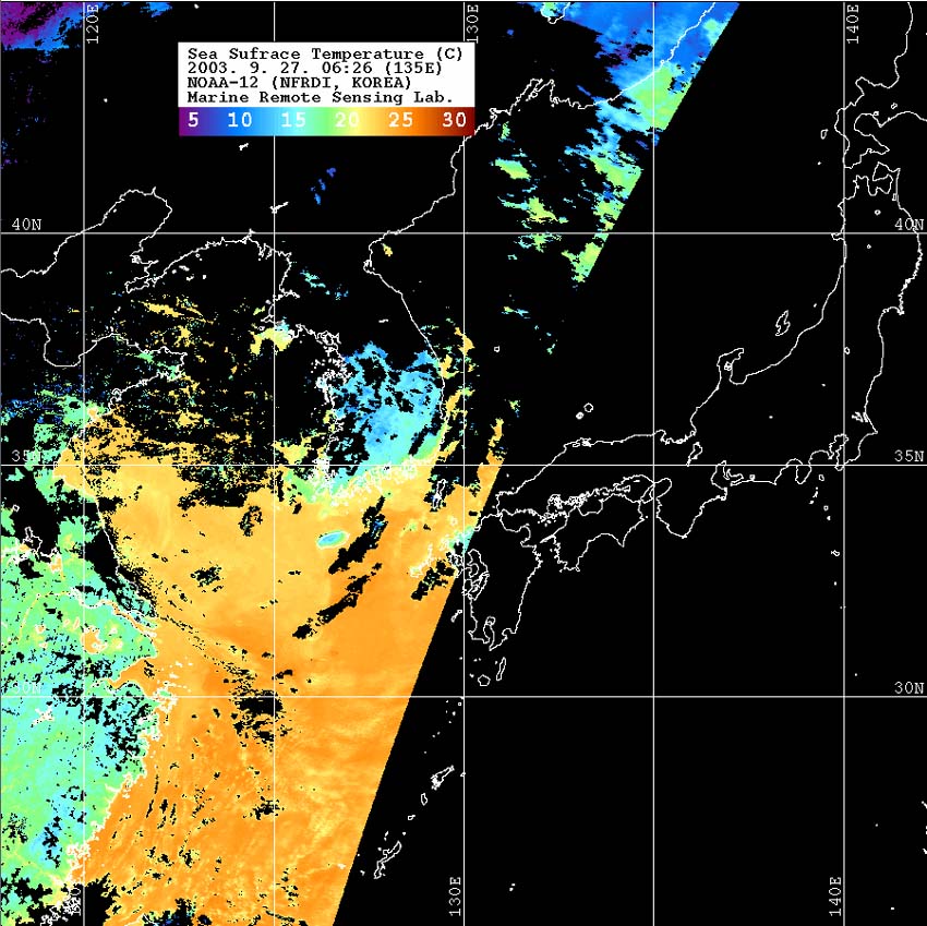 o 2003년 9월 27일 06시 26분 NOAA-12호 위성영상입니다. o 수온분포는 범례를 참고하시기 바랍니다. o 검은색은 구름과 육지를 나타냅니다.
