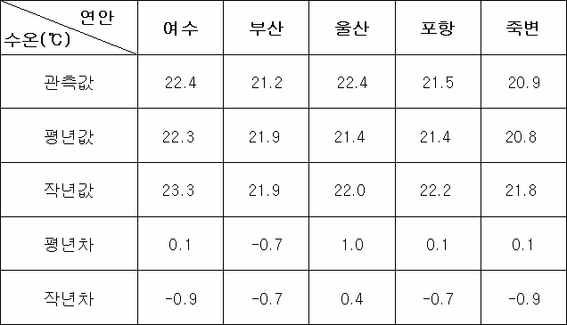 o 작년에 비해 오늘 수온은 여수 및 부산 1도 낮게, 울산 0.5도 높게, 포항 및 죽변