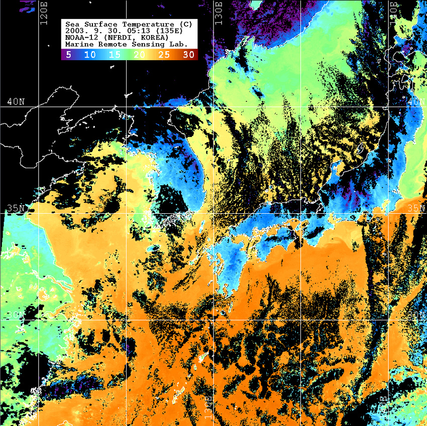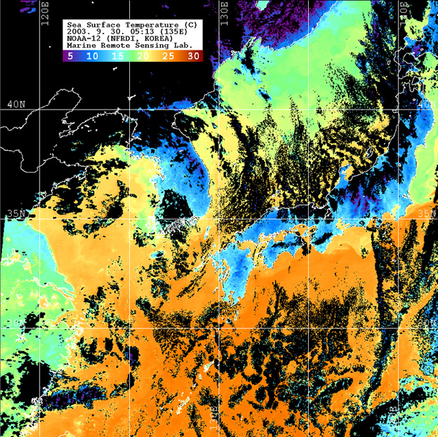 o 2003년 9월 30일 05시 13분 NOAA-12호 위성영상입니다. o 수온분포는 범례를 참고하시기 바랍니다. o 검은색은 구름과 육지를 나타냅니다.