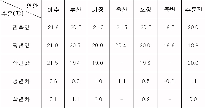 o 평년에 비해 오늘 수온은 여수 0.5도 높게, 부산 비슷하게, 기장 및 울산 1도 높게,