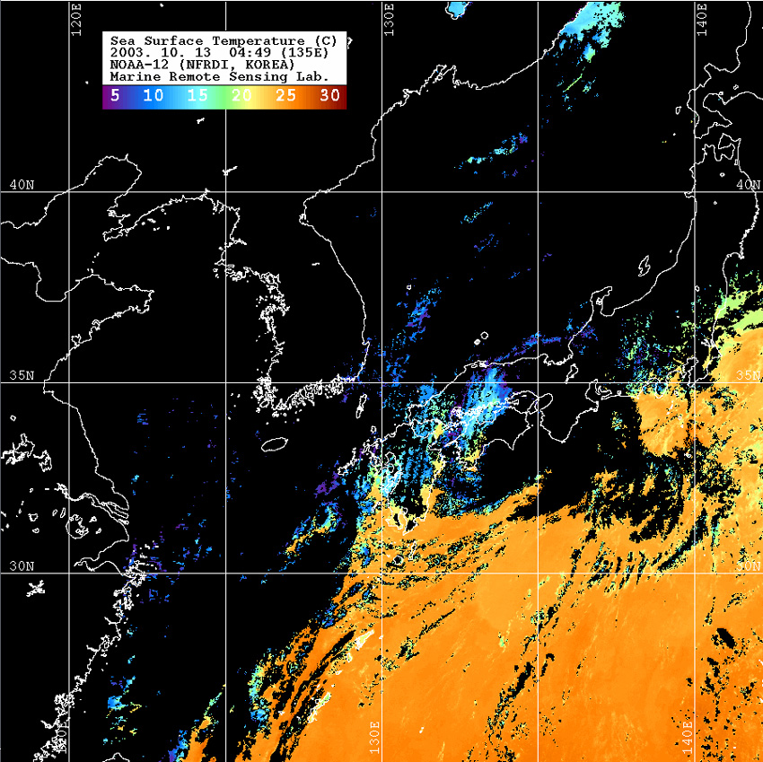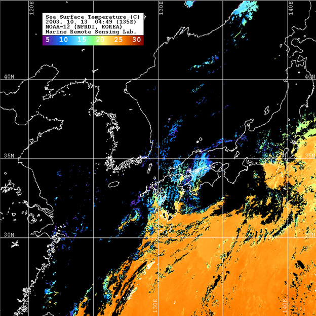 o 2003년 10월 13일 04시 49분 NOAA-12호 위성영상입니다. o 수온분포는 범례를 참고하시기 바랍니다. o 검은색은 구름과 육지를 나타냅니다.