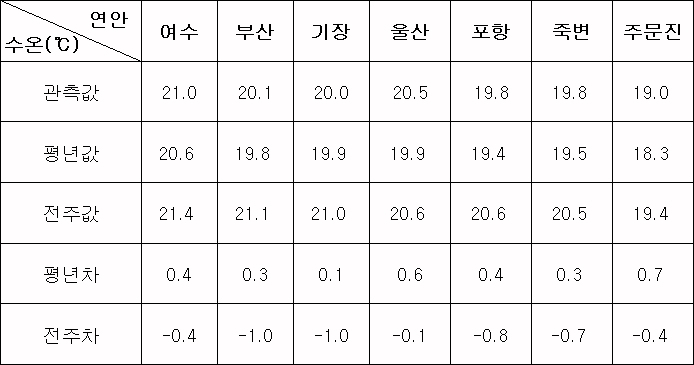 o 평년에 비해 오늘 수온은 여수 및 부산 0.5도 높게, 기장 비슷하게, 울산, 포항,