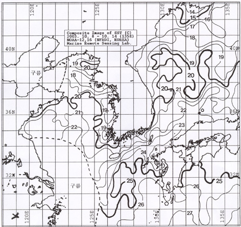 o 수온전선대는 수온 19도를 중심으로 진도연안에서, 수온 21도를 중심으로