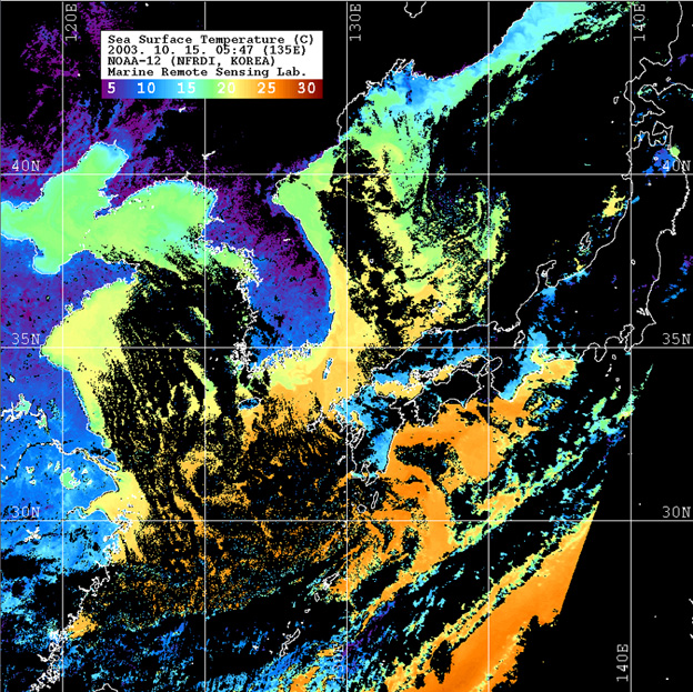 o 2003년 10월 15일 05시 47분 NOAA-12호 위성영상입니다. o 수온분포는 범례를 참고하시기 바랍니다. o 검은색은 구름과 육지를 나타냅니다.