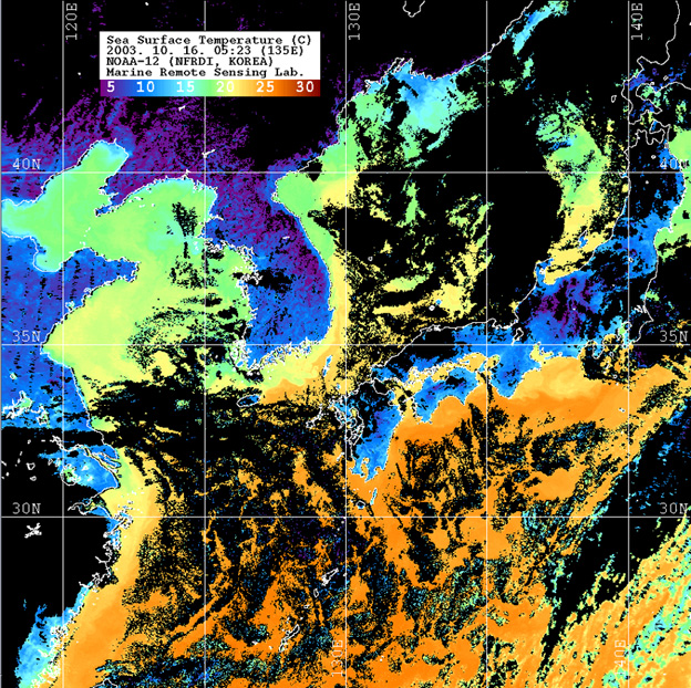 o 2003년 10월 16일 05시 23분 NOAA-12호 위성영상입니다. o 수온분포는 범례를 참고하시기 바랍니다. o 검은색은 구름과 육지를 나타냅니다.