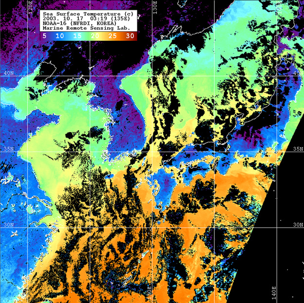 o 2003년 10월 17일 03시 19분 NOAA-16호 위성영상입니다. o 수온분포는 범례를 참고하시기 바랍니다. o 검은색은 구름과 육지를 나타냅니다.