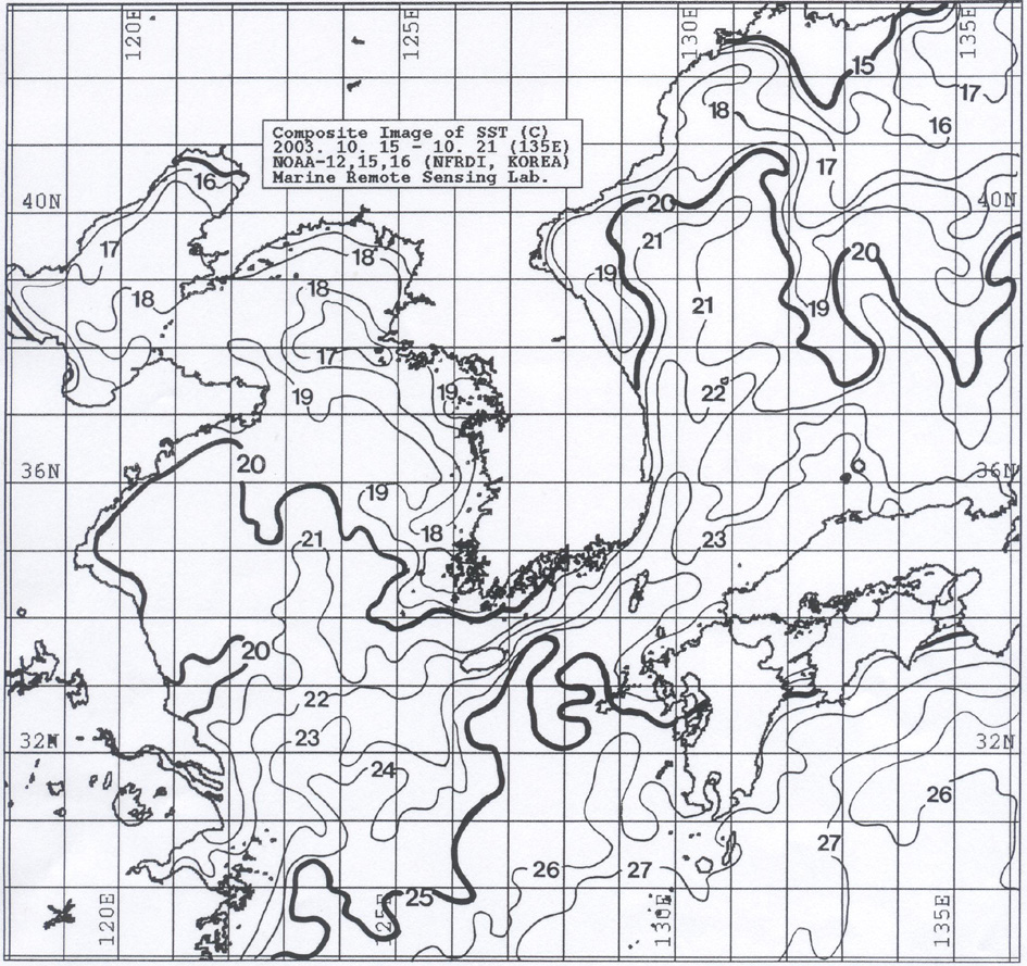 o 아래 그림은 2003년 10월 15일부터 10월 21일 까지 합성한 위성추정 표면 수온 분포도입니다. o 대화퇴 근해 17∼18도, 울릉도 근해 20∼21도, 대마도 근해 23∼24도, 제주도 근해 21∼22도, 이어도 근해 22∼24도, 일향초 근해 19∼20도, 어청도 근해 18∼19도 내외로 나타납니다. o「평년에 비해」수온은 대화퇴 근해 1도 낮게, 울릉도 및 대마도 근해 1도 높게, 제주도 비슷하게, 이어도 근해 1도 높게, 일향초 및 어청도 근해 비슷하게 나타납니다. o 수온전선대는 수온 19도를 중심으로 진도연안에서, 수온 22도를 중심으로 제주도∼ 대마도간 해역에서 형성됩니다. < 위의 그림을 클릭하시면 확대된 수온정보를 보실 수 있습니다 >