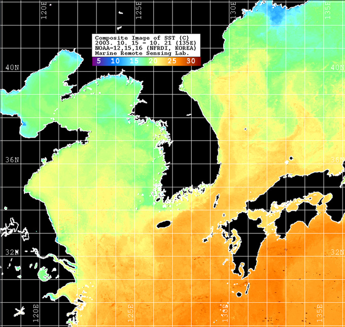 | 위성 수온 영상(2003. 10. 15 ~ 10. 21) | |||||