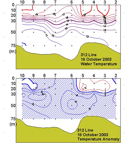 ㅇ2003년 10월 18일 국립수산과학원 서해수산연구소에서 조사한 312선(제주해협 서방)의 수직수온분포도 및 평년편차도 입니다.