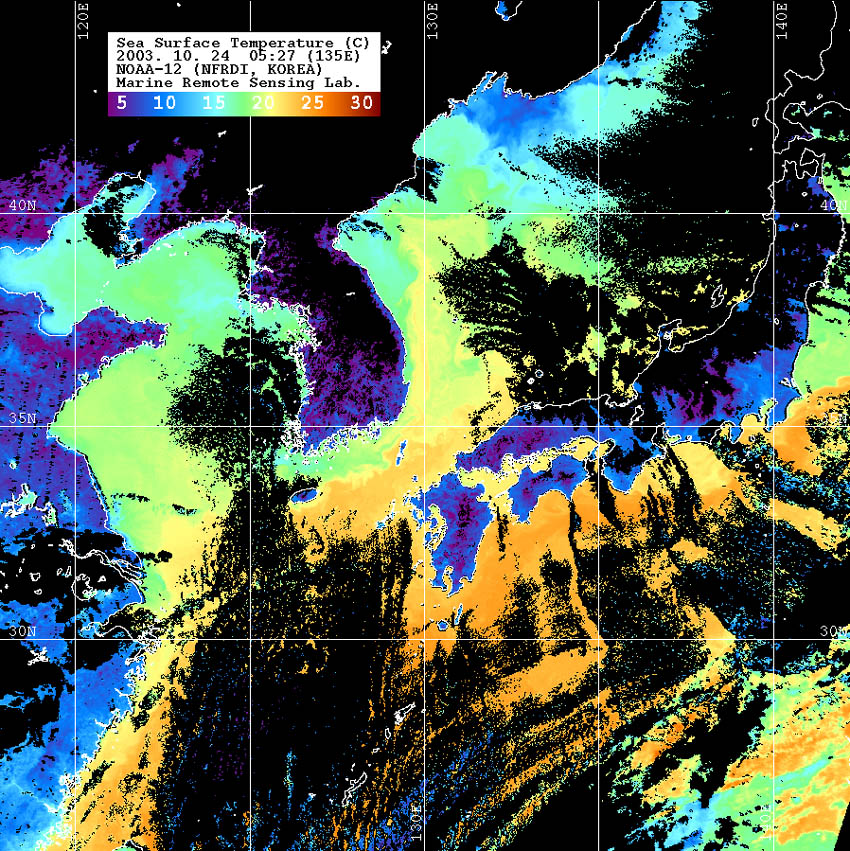 o 2003년 10월 24일 05시 27분 NOAA-12호 위성영상입니다. o 수온분포는 범례를 참고하시기 바랍니다. o 검은색은 구름과 육지를 나타냅니다.