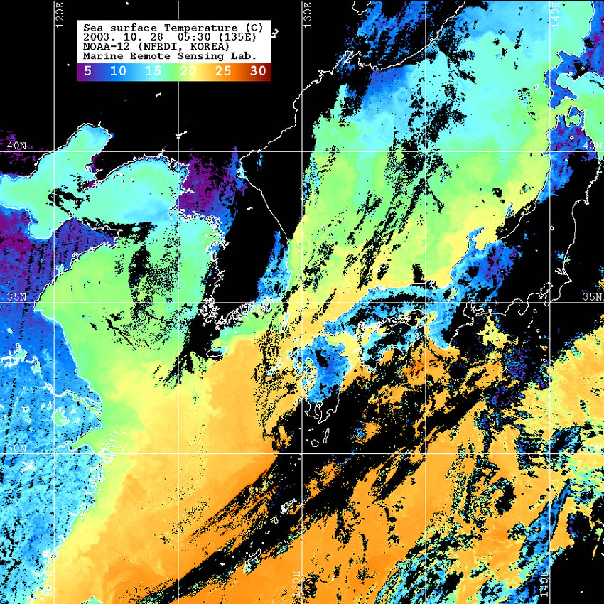o 2003년 10월 28일 05시 30분 NOAA-12호 위성영상입니다. o 수온분포는 범례를 참고하시기 바랍니다. o 검은색은 구름과 육지를 나타냅니다.