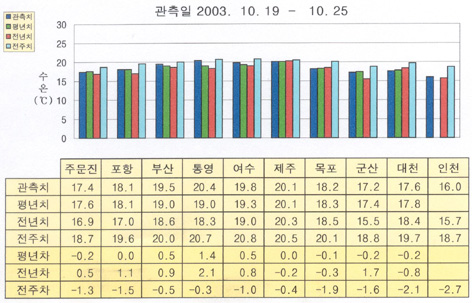 o 최근(2003. 10.19∼ 10.25)의 한반도 연안 표면수온은 동해 연안역에서 섭씨
