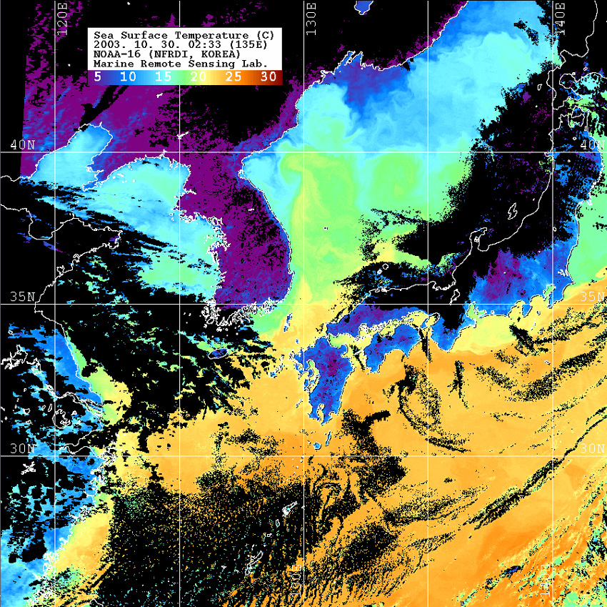o 2003년 10월 30일 02시 33분 NOAA-12호 위성영상입니다. o 수온분포는 범례를 참고하시기 바랍니다. o 검은색은 구름과 육지를 나타냅니다.