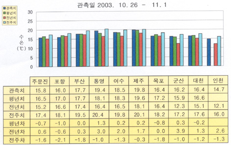 o 최근(2003. 10.26∼ 11.1)의 한반도 연안 표면수온은 동해 연안역에서 섭씨