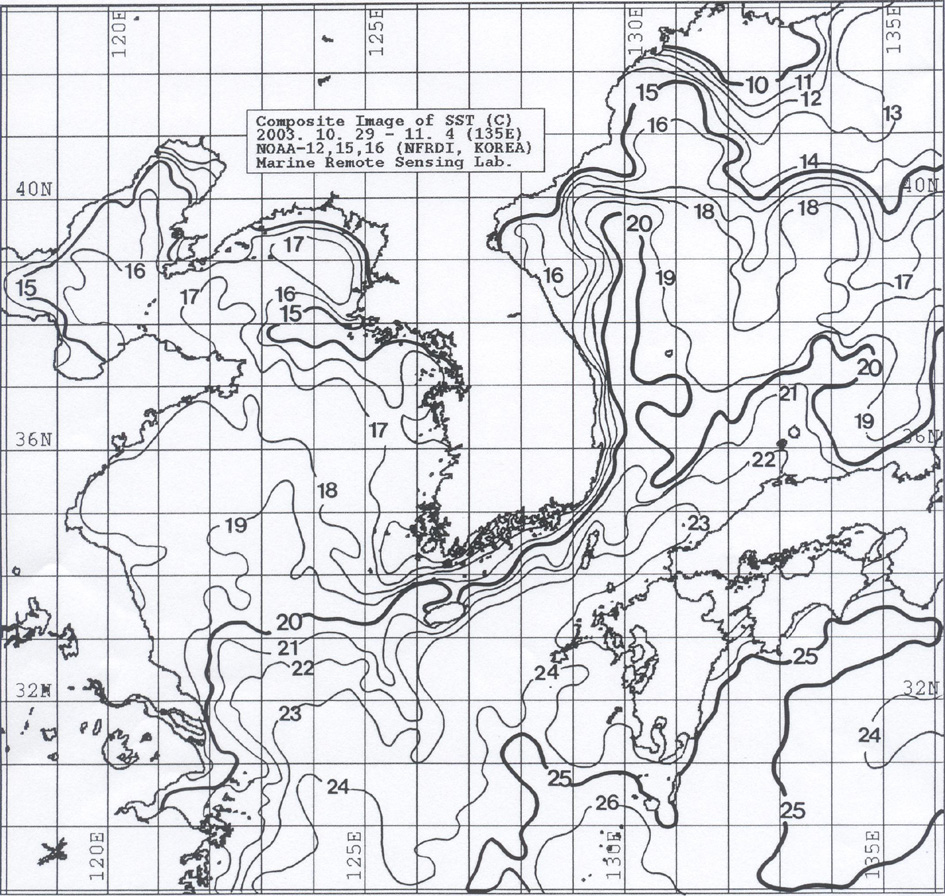 o 아래 그림은 2003년 10월 29일부터 11월 4일 까지 합성한 위성추정 표면 수온 분포도입니다. o 대화퇴 근해 15∼17도, 울릉도 근해 19∼20도, 대마도 근해 22∼23도, 제주도 근해 20∼22도, 이어도 근해 22∼23도, 일향초 근해 17∼18도, 어청도 근해 16∼17도 내외로 나타납니다. o「평년에 비해」수온은 대화퇴 근해 0.5도 낮게, 울릉도 및 대마도 근해 1.5도 높게, 제주도 비슷하게, 이어도 1.5도 높게, 일향초 비슷하게, 어청도 근해 0.5도 낮게 나타납니다. o 수온전선대는 수온 16도를 중심으로 진도연안에서, 수온 22도를 중심으로 제주도∼ 대마도간 해역에서 형성됩니다. < 위의 그림을 클릭하시면 확대된 수온정보를 보실 수 있습니다 >