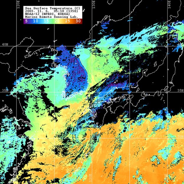 o 2003년 11월 6일 05시 10분 NOAA-12호 위성영상입니다. o 수온분포는 범례를 참고하시기 바랍니다. o 검은색은 구름과 육지를 나타냅니다.
