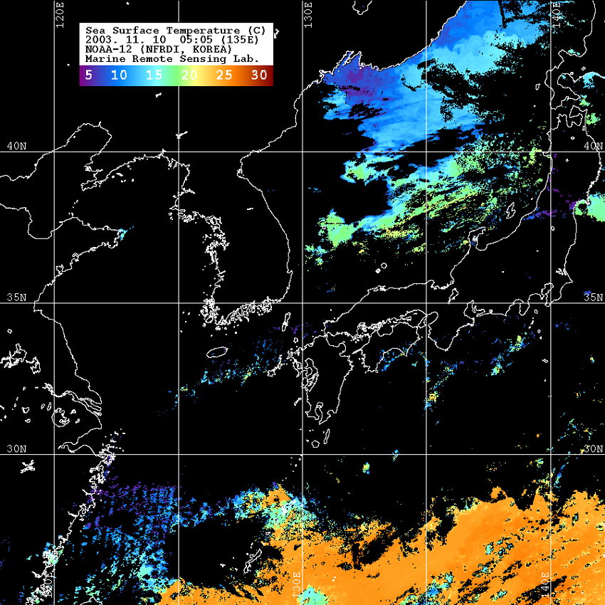 o 2003년 11월 10일 05시 05분 NOAA-12호 위성영상입니다. o 수온분포는 범례를 참고하시기 바랍니다. o 검은색은 구름과 육지를 나타냅니다.