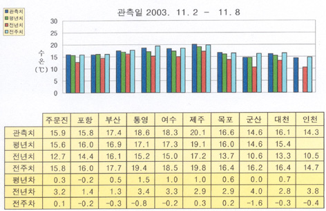 o 최근(2003. 11. 2∼ 11.8)의 한반도 연안 표면수온은 동해 연안역에서 섭씨
