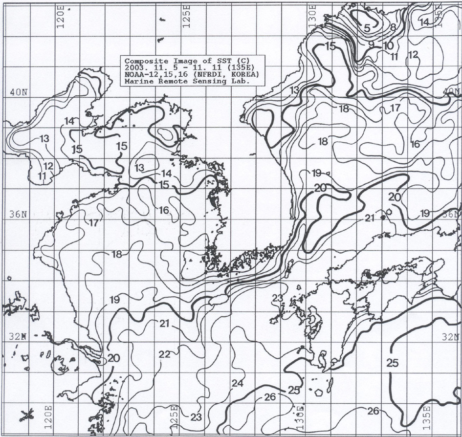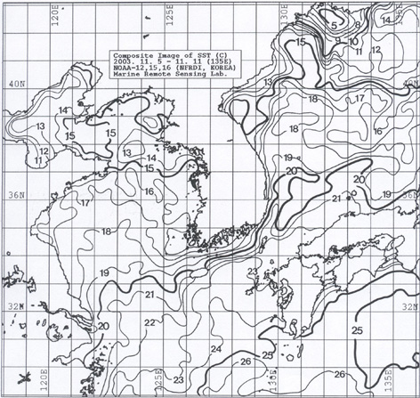 o 수온전선대는 수온 16도를 중심으로 진도연안에서, 수온 21도를 중심으로 제주도∼