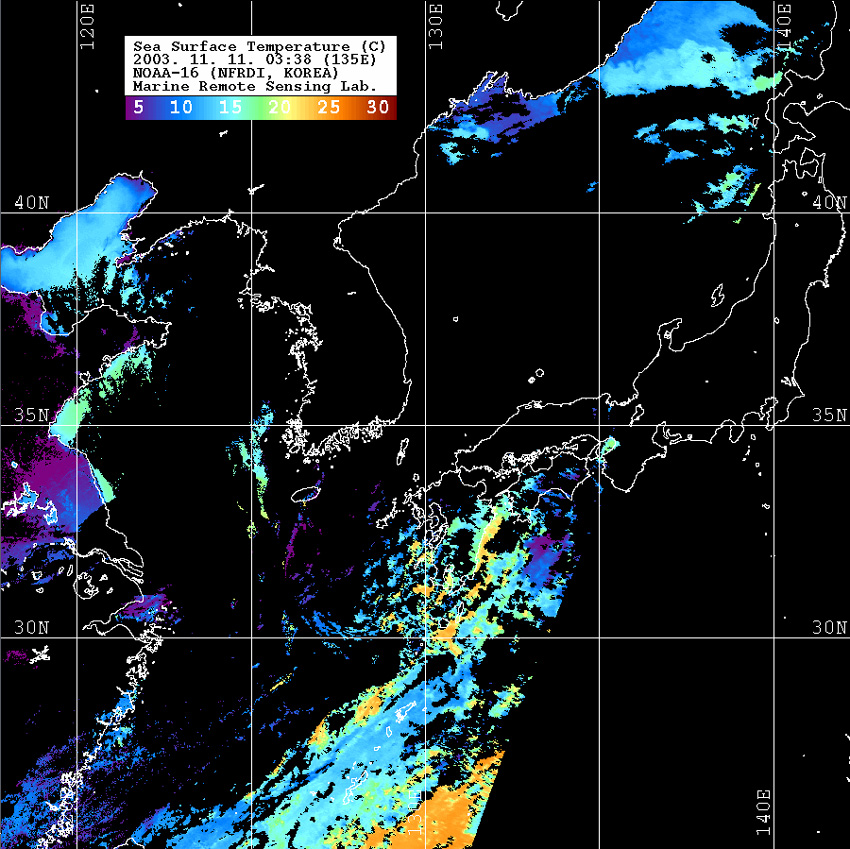 o 2003년 11월 11일 03시 38분 NOAA-16호 위성영상입니다. o 수온분포는 범례를 참고하시기 바랍니다. o 검은색은 구름과 육지를 나타냅니다.