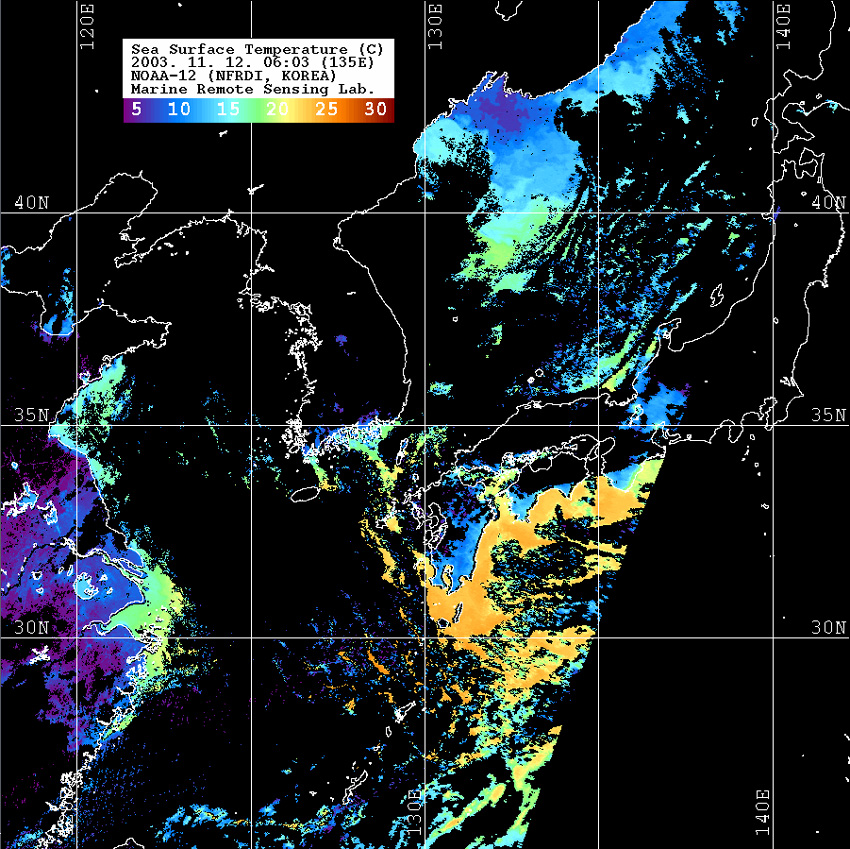 o 2003년 11월 12일 06시 03분 NOAA-12호 위성영상입니다. o 수온분포는 범례를 참고하시기 바랍니다. o 검은색은 구름과 육지를 나타냅니다.