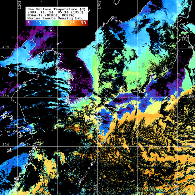 o 2003년 11월 14일 05시 14분 NOAA-12호 위성영상입니다. o 수온분포는 범례를 참고하시기 바랍니다. o 검은색은 구름과 육지를 나타냅니다.