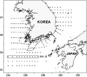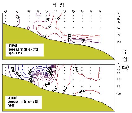 o 2003년 11월 6∼7일 국립수산과학원 해양연구과에서 조사한 315선(동중국해 북부해역)의 연직수온 분포도입니다.