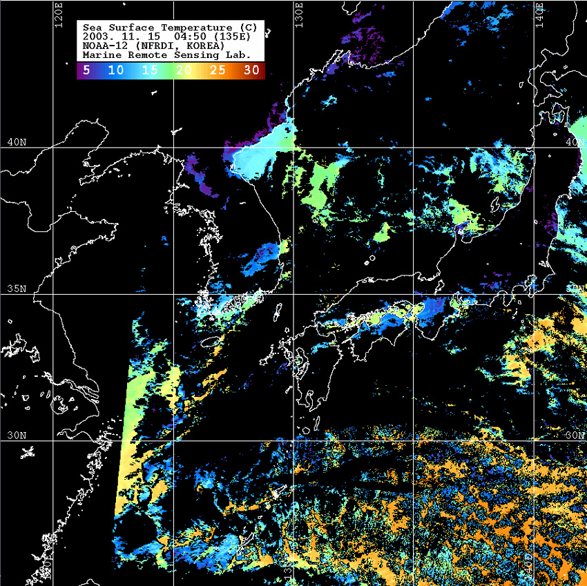 o 2003년 11월 15일 04시 50분 NOAA-12호 위성영상입니다. o 수온분포는 범례를 참고하시기 바랍니다. o 검은색은 구름과 육지를 나타냅니다.