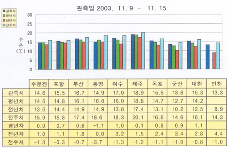 o 최근(2003. 11. 9∼ 11.15)의 한반도 연안 표면수온은 동해 연안역에서 섭씨