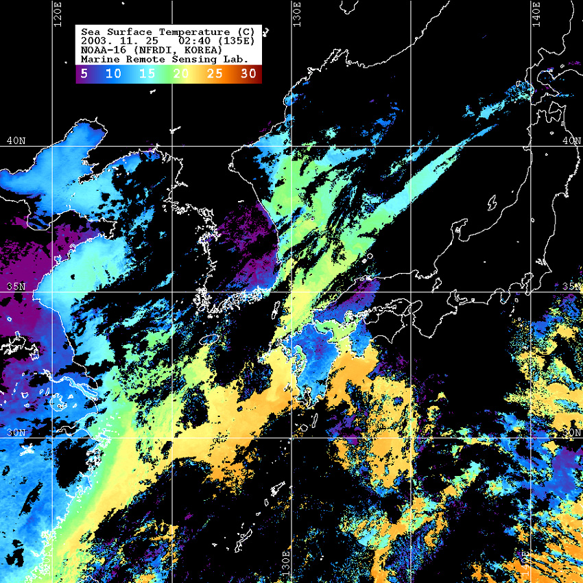 o 2003년 11월 25일 02시 40분 NOAA-16호 위성영상입니다. o 수온분포는 범례를 참고하시기 바랍니다. o 검은색은 구름과 육지를 나타냅니다.
