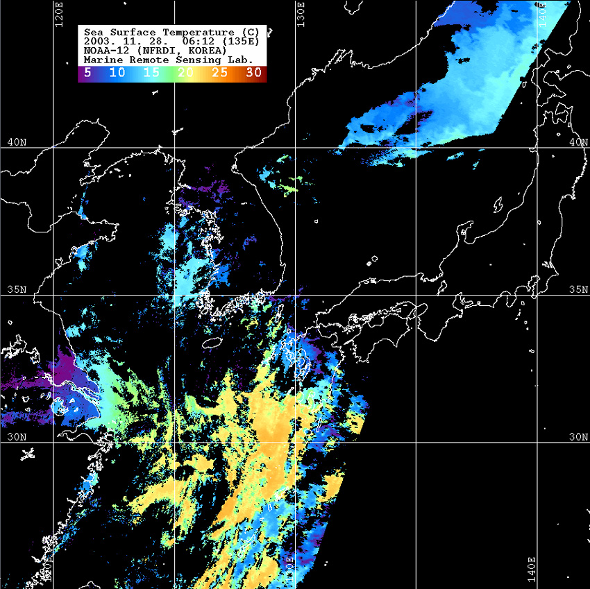 o 2003년 11월 28일 06시 12분 NOAA-12호 위성영상입니다. o 수온분포는 범례를 참고하시기 바랍니다. o 검은색은 구름과 육지를 나타냅니다.