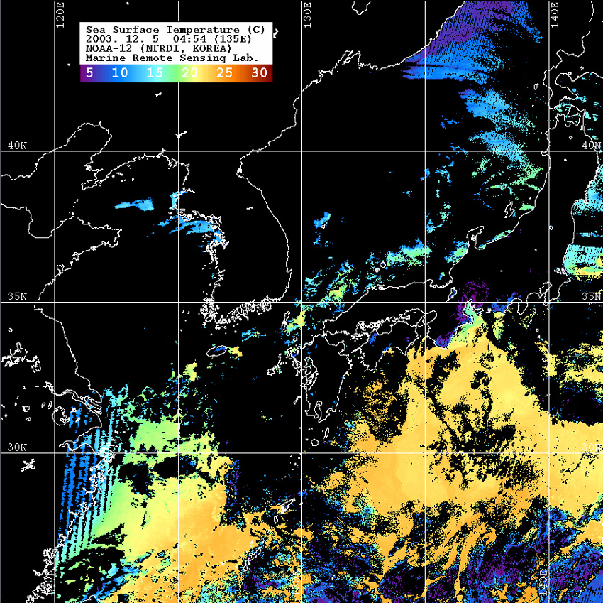 o 2003년 12월 5일 04시 54분 NOAA-12호 위성영상입니다. o 수온분포는 범례를 참고하시기 바랍니다. o 검은색은 구름과 육지를 나타냅니다.