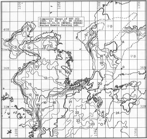 o 아래 그림은 2003년 12월 2일부터 12월 8일 까지 합성한 위성추정 표면 수온 분포도입니다. o 대화퇴 근해 13∼14도, 울릉도 근해 17∼18도, 대마도 근해 20∼21도, 제주도 근해 19∼20도, 이어도 근해 18∼19도, 일향초 근해 14∼15도, 어청도 근해 9∼10도 내외로 나타납니다. o「평년에 비해」수온은 대화퇴 근해 및 울릉도 근해 1.5도 높게, 대마도 근해 0.5도 높게, 제주도 1.5도 높게 이어도 1도 높게, 일향초 비슷하게, 어청도 근해 2도 낮게 나타납니다. o 수온전선대는 수온 15도를 중심으로 주문진 연근해에서, 수온 19도를 중심으로 제주도∼대마도간 해역에서 형성됩니다. < 위의 그림을 클릭하시면 확대된 수온정보를 보실 수 있습니다 >